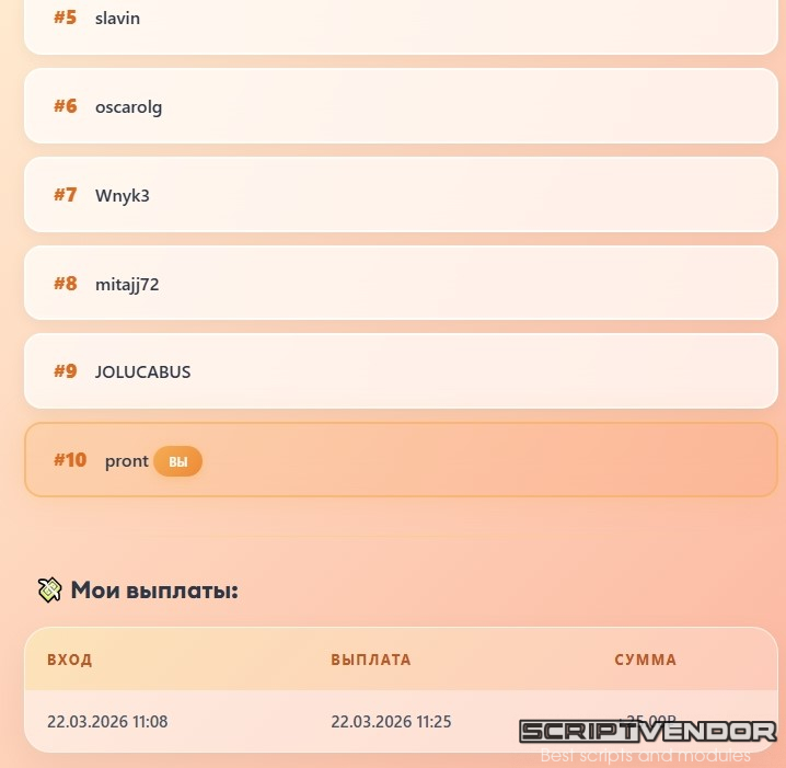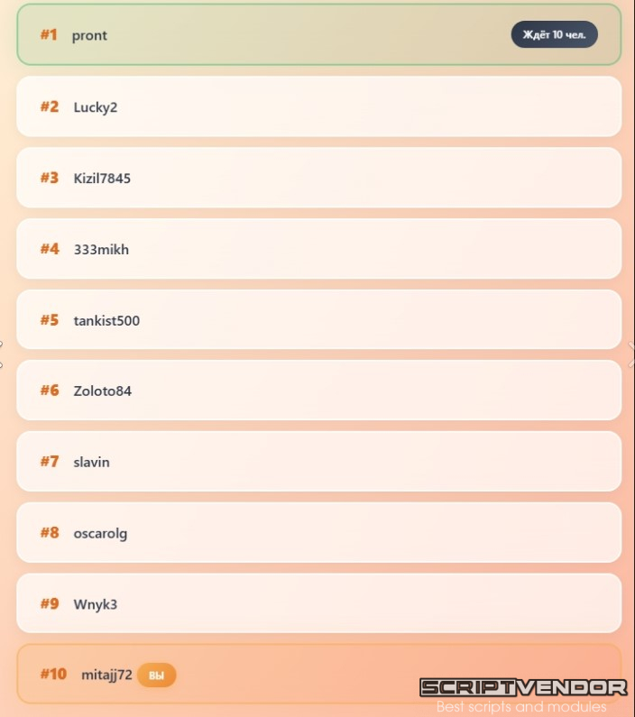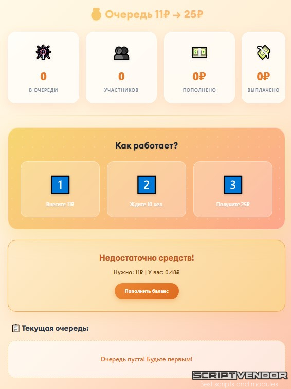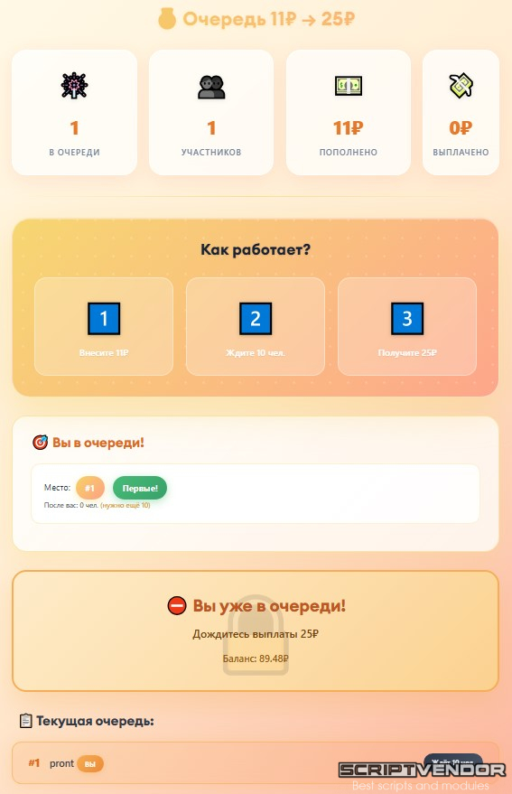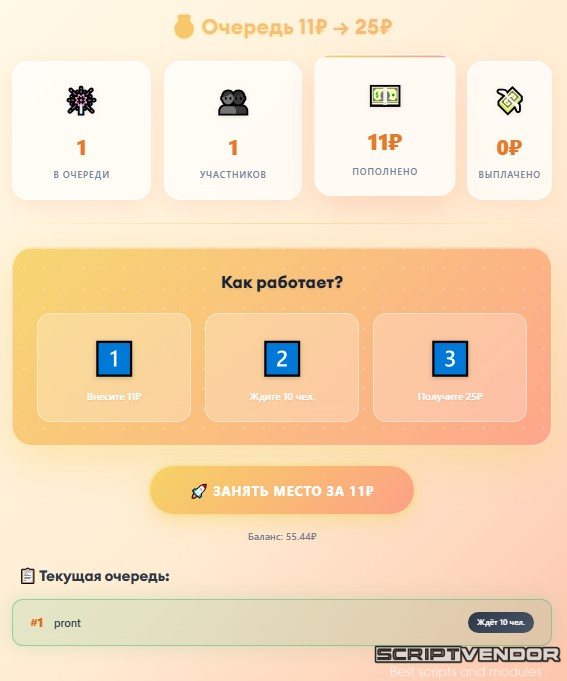 Это модуль Живой очереди ( игры/букса/бонусника/майнинга для FastCore ) для игрового проекта. Пользователь платит 11₽, ждёт пока за ним встанут ещё 10 человек, и получает 25₽.