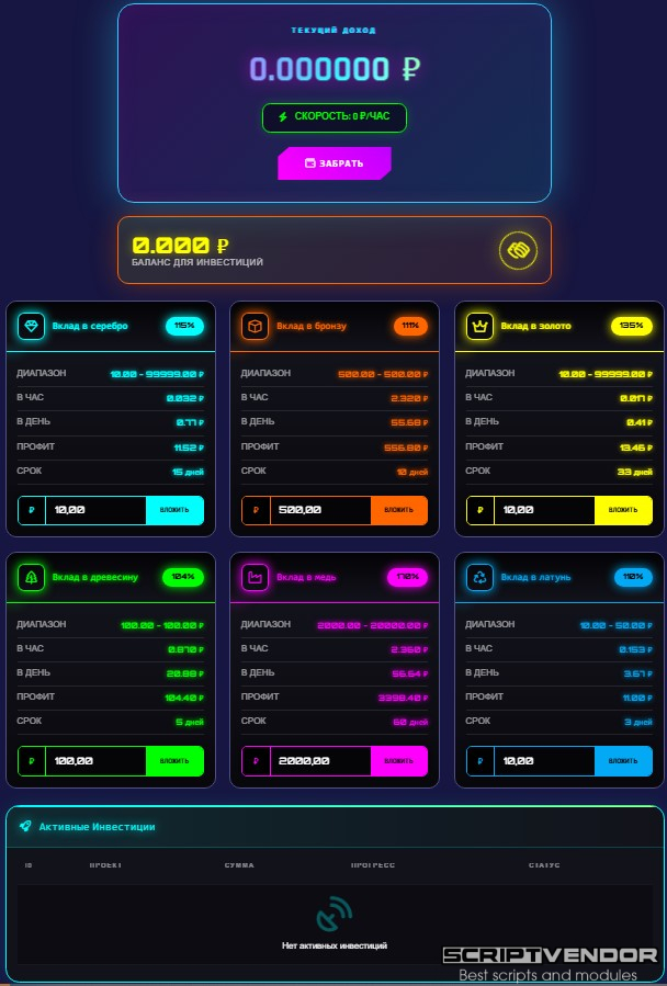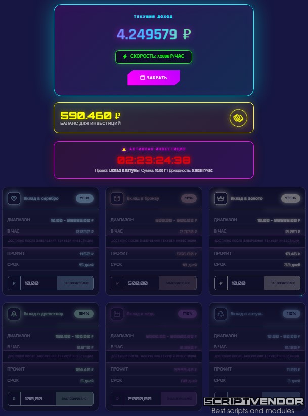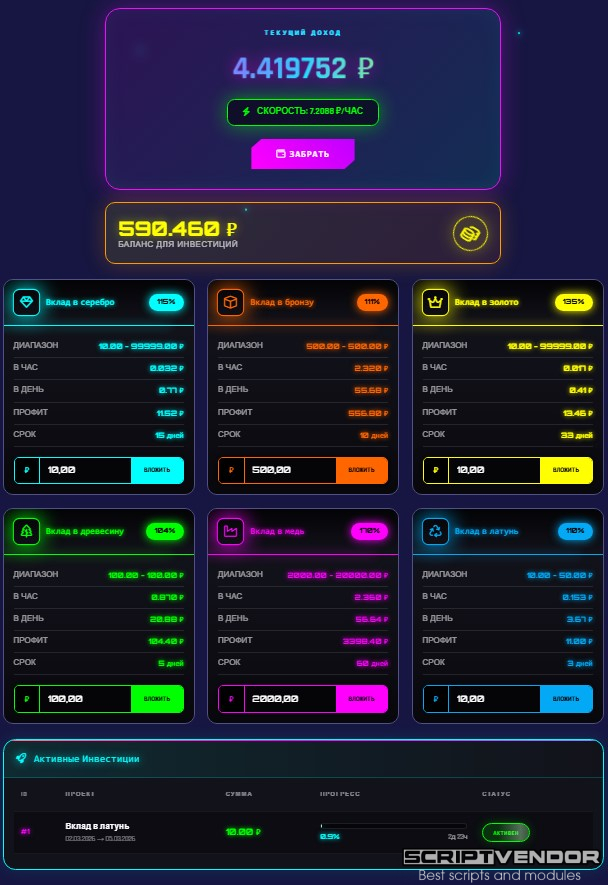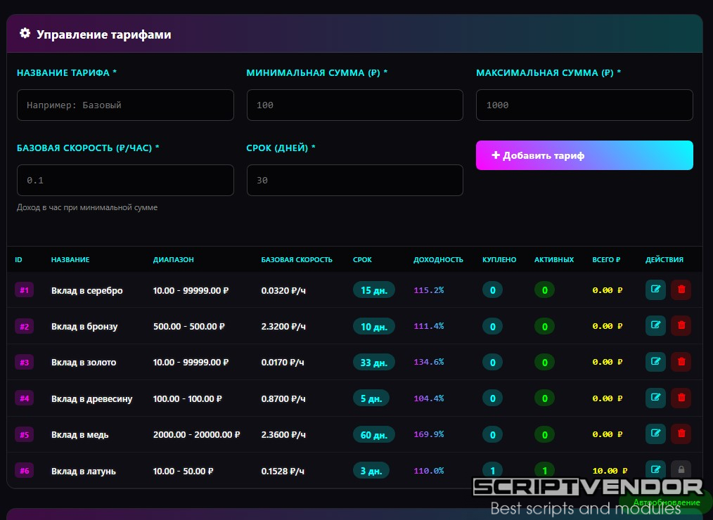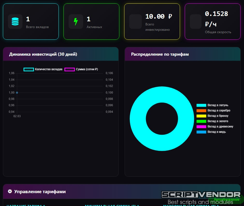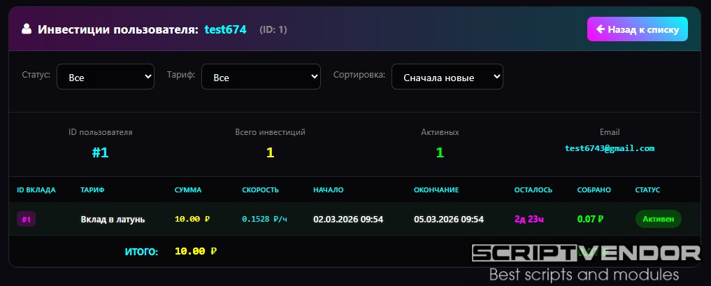 Видеть для каждого: ID, логин, email, количество вкладов, суммы, скорость, дату последней инвестиции