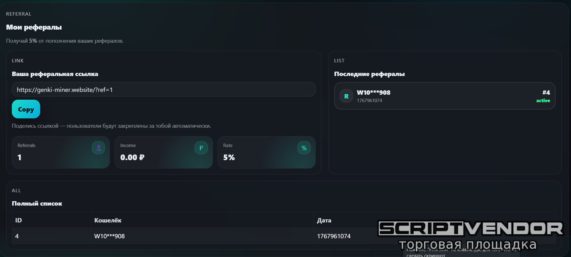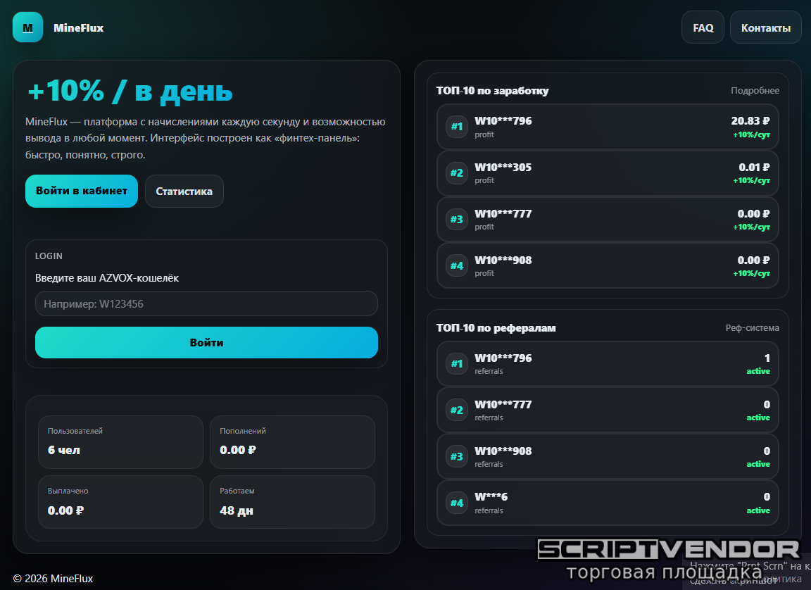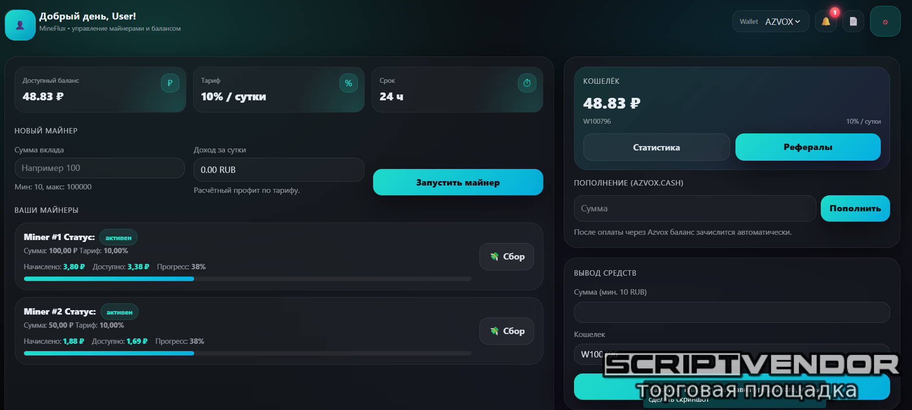 Тариф настроен на 24 часа можно настроить под себя любой процент в любой срок настраивается в админке также в админке подключаются платёжная система.