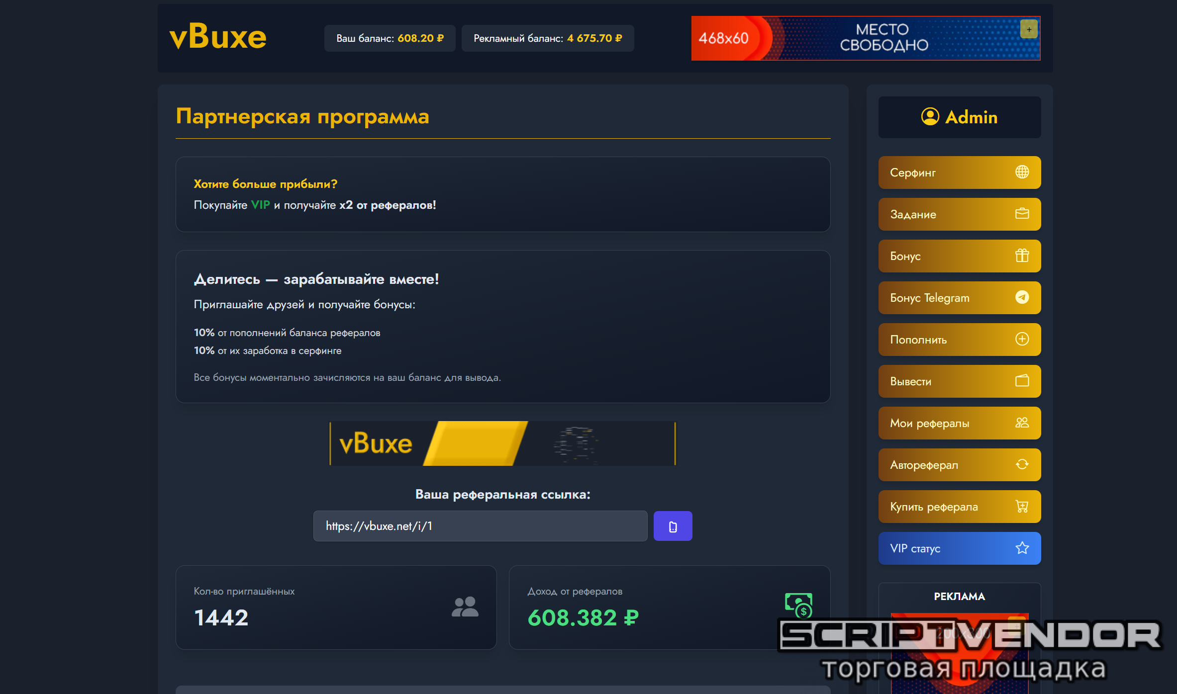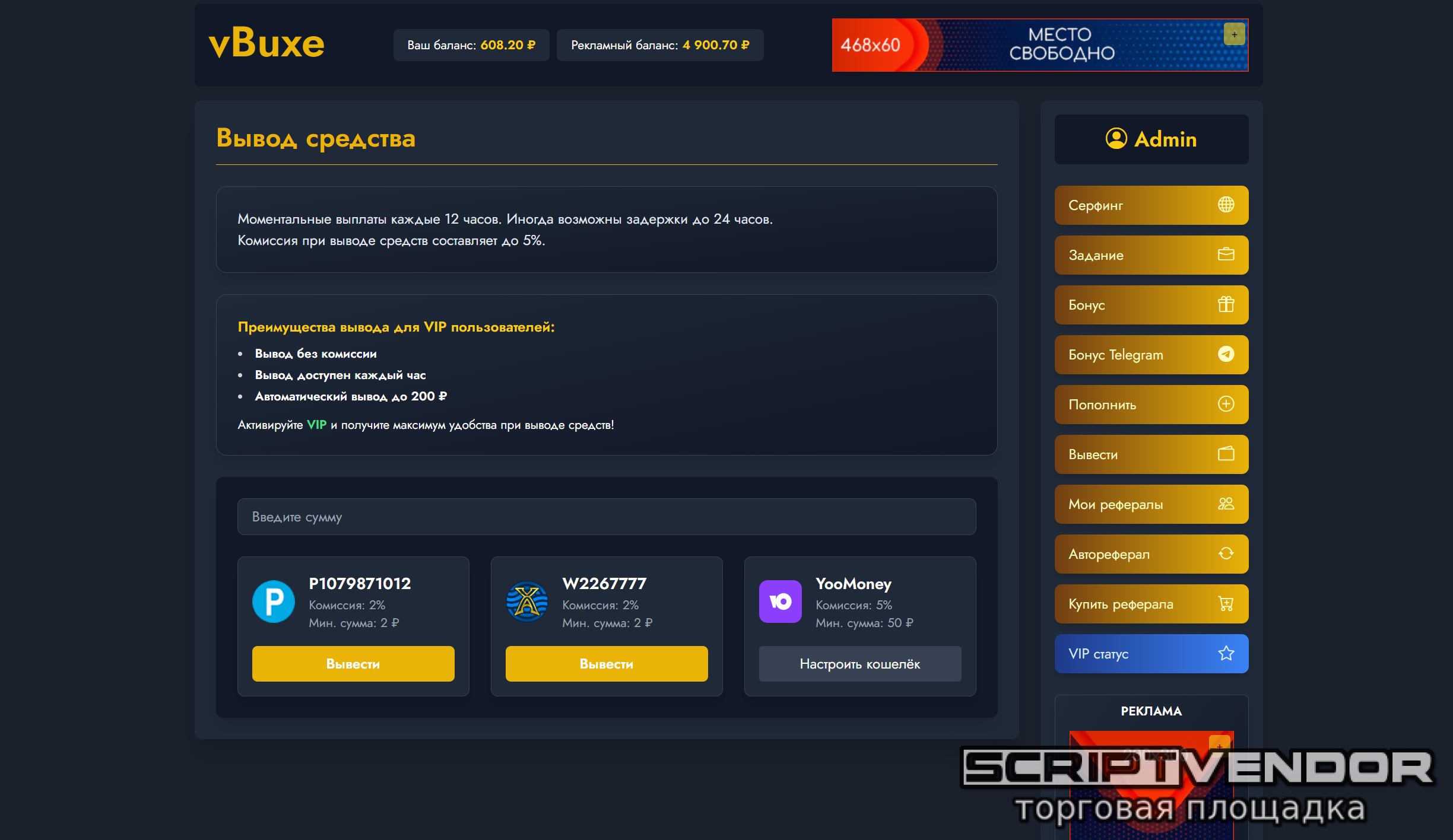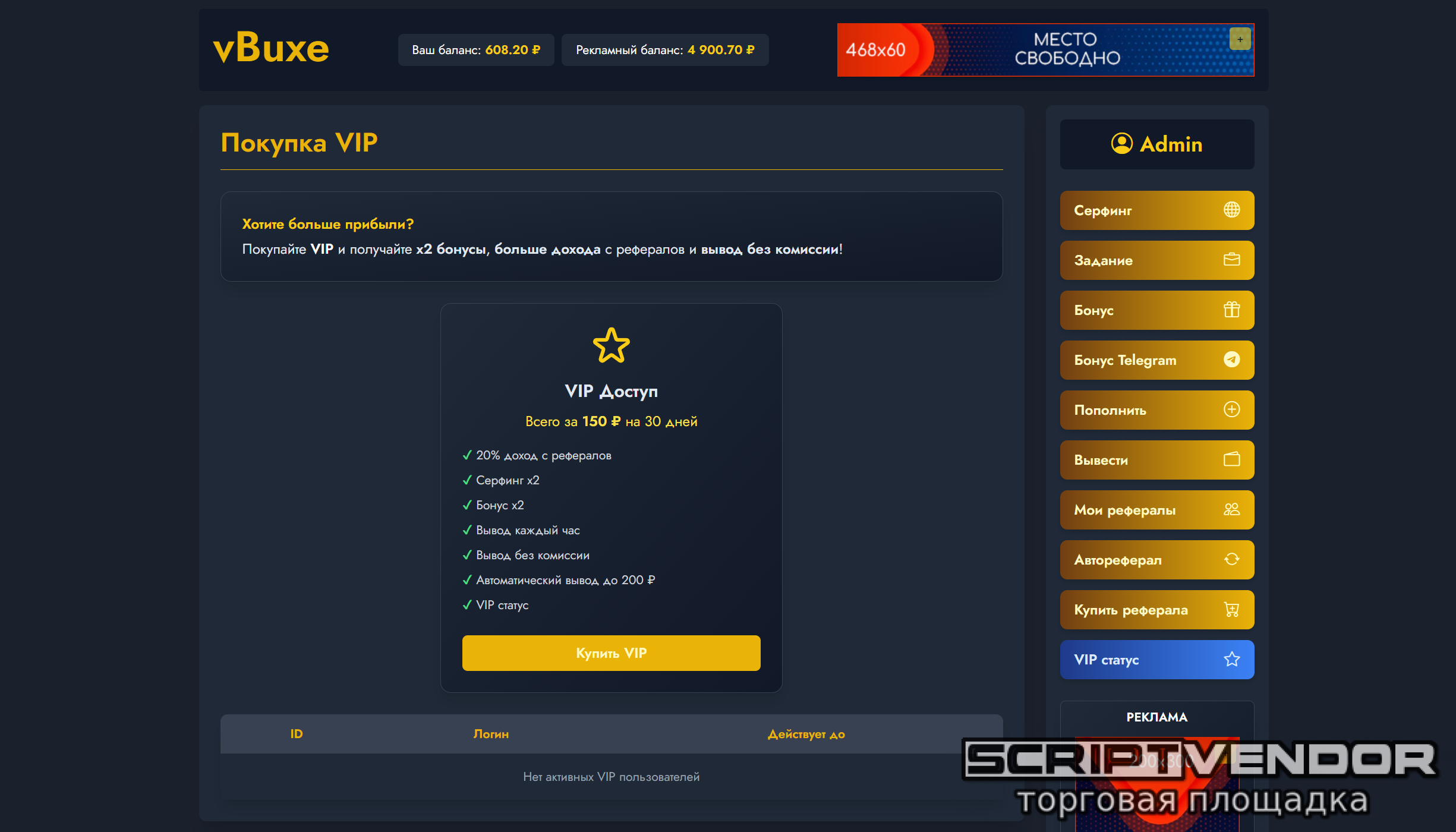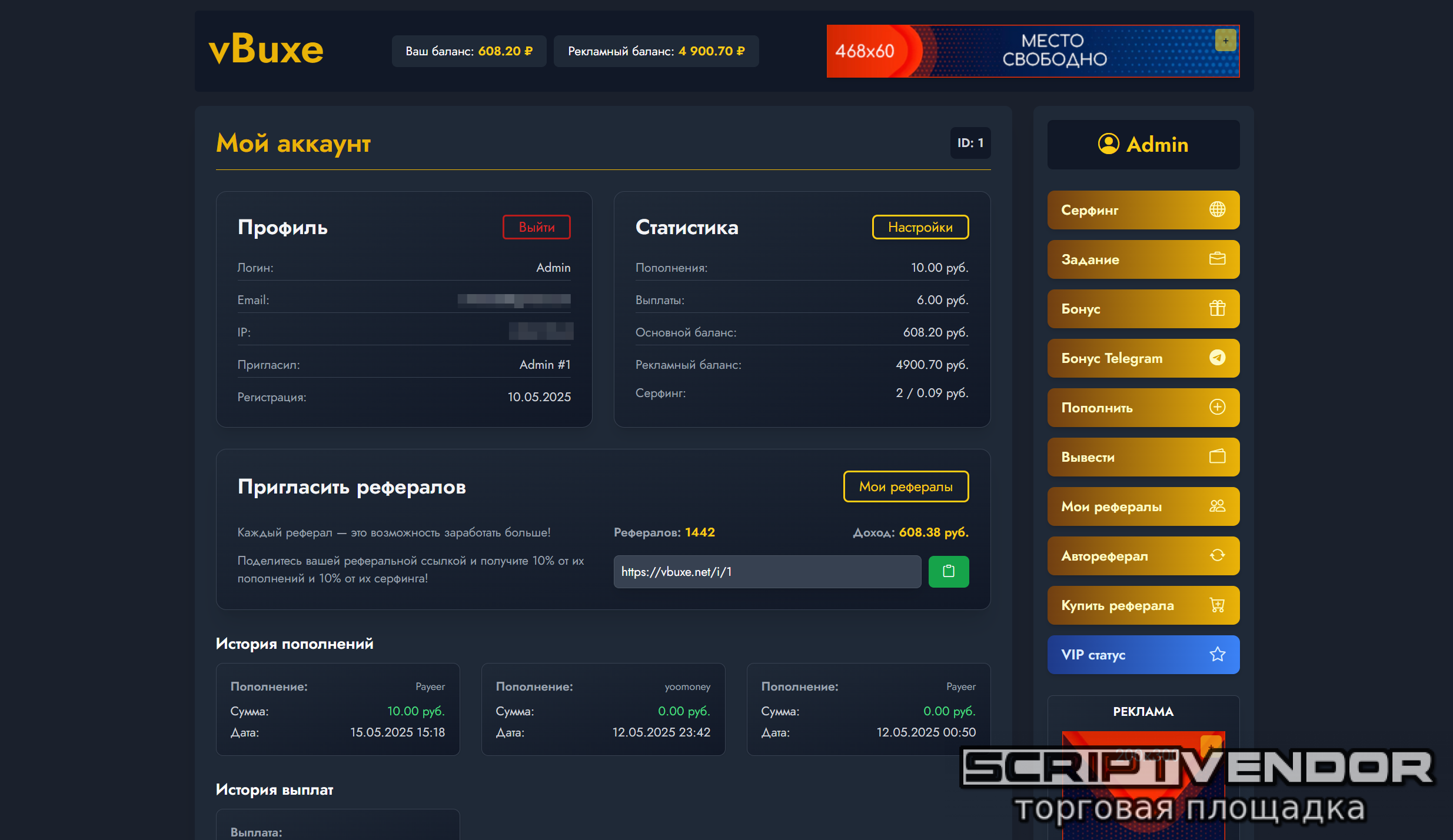 - Есть куча модулей: Серфинг, Youtube, задания, короткие ссылки, автореферал, собственные баннеры, VIP и другое