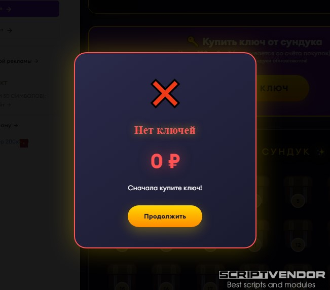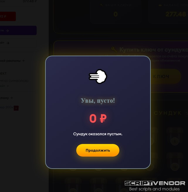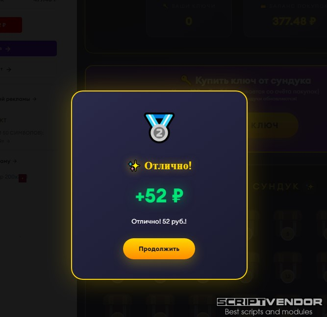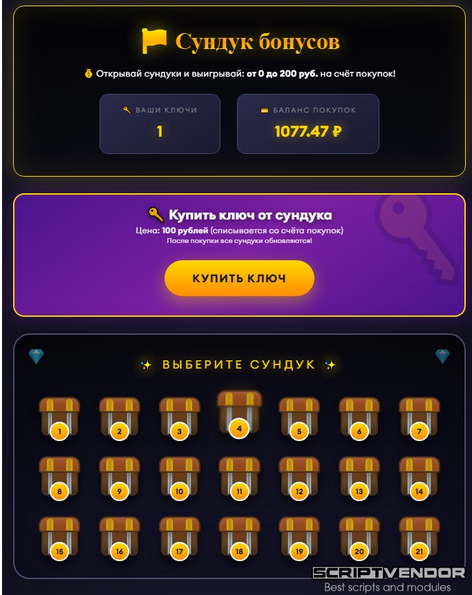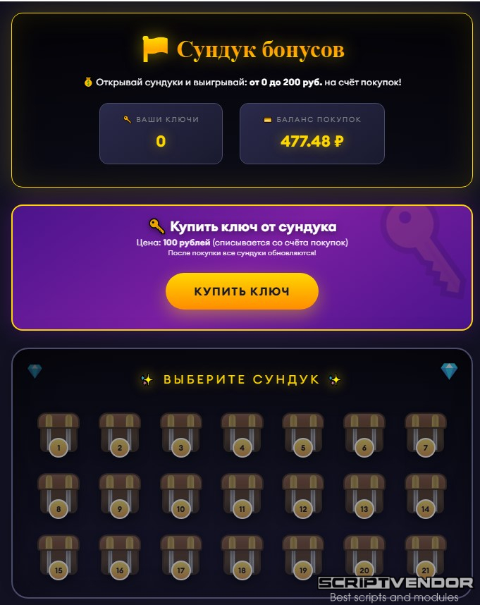 — игровой модуль для экономической игры/букса/бонусника/майнинга для FastCore . Пользователи покупают ключи за реальные деньги (со счёта покупок) и открывают сундуки с шансом выиграть от 0 до 200 рублей на счёт выплат.