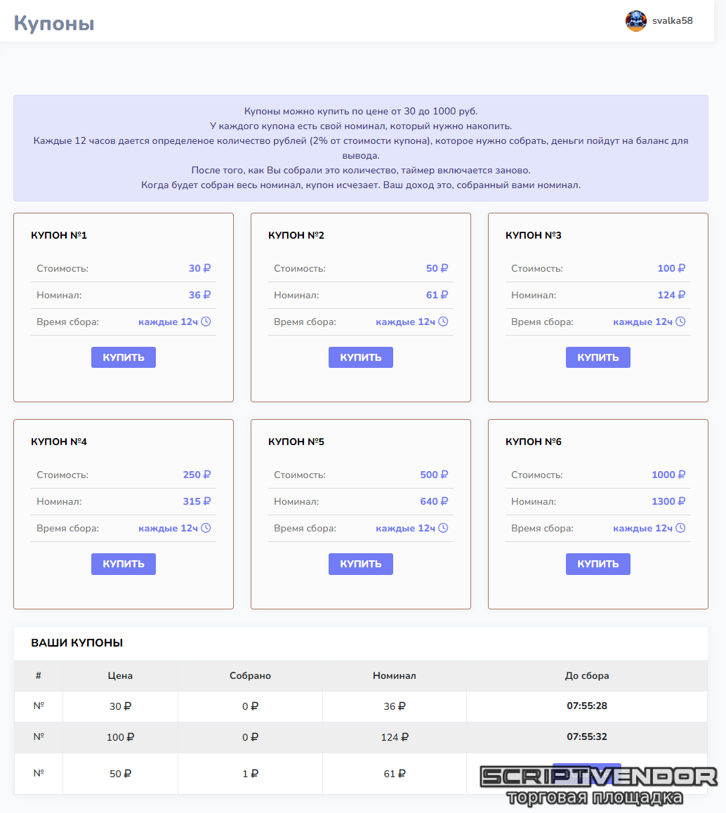 Каждые 12 часов дается определеное количество рублей (2% от стоимости купона), которое нужно собрать, деньги пойдут на баланс для вывода.