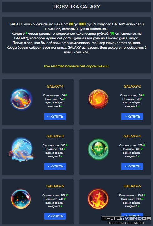 Каждые 9 часов дается определеное количество рублей (1% от стоимости GALAXY), которое нужно собрать, деньги пойдут на баланс для вывода.