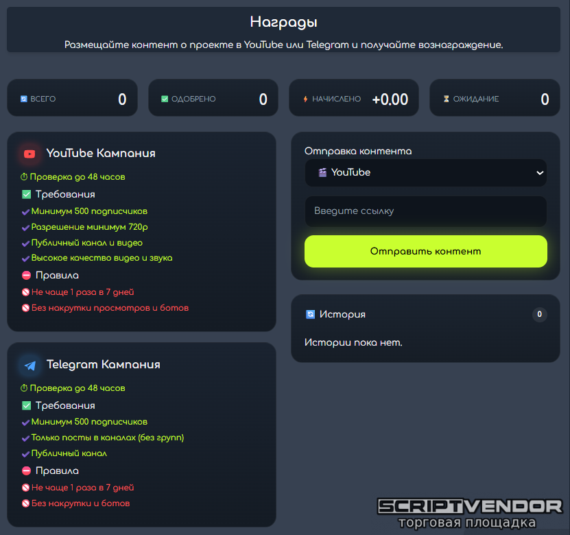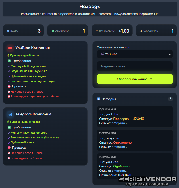 • Вознаграждения за публикации в YouTube и Telegram