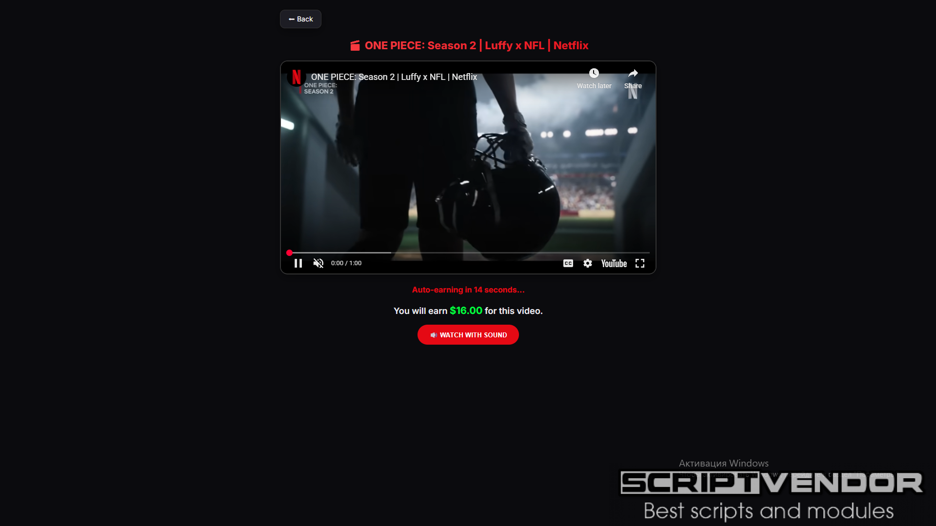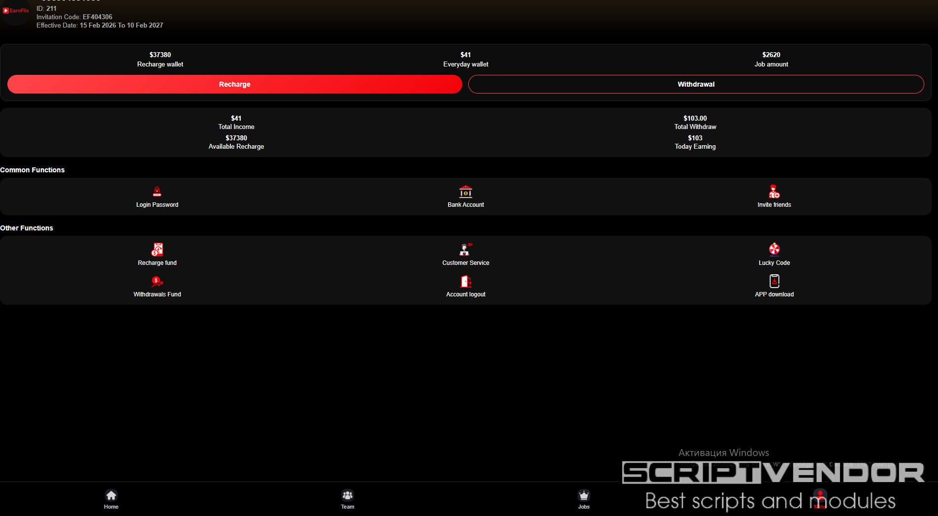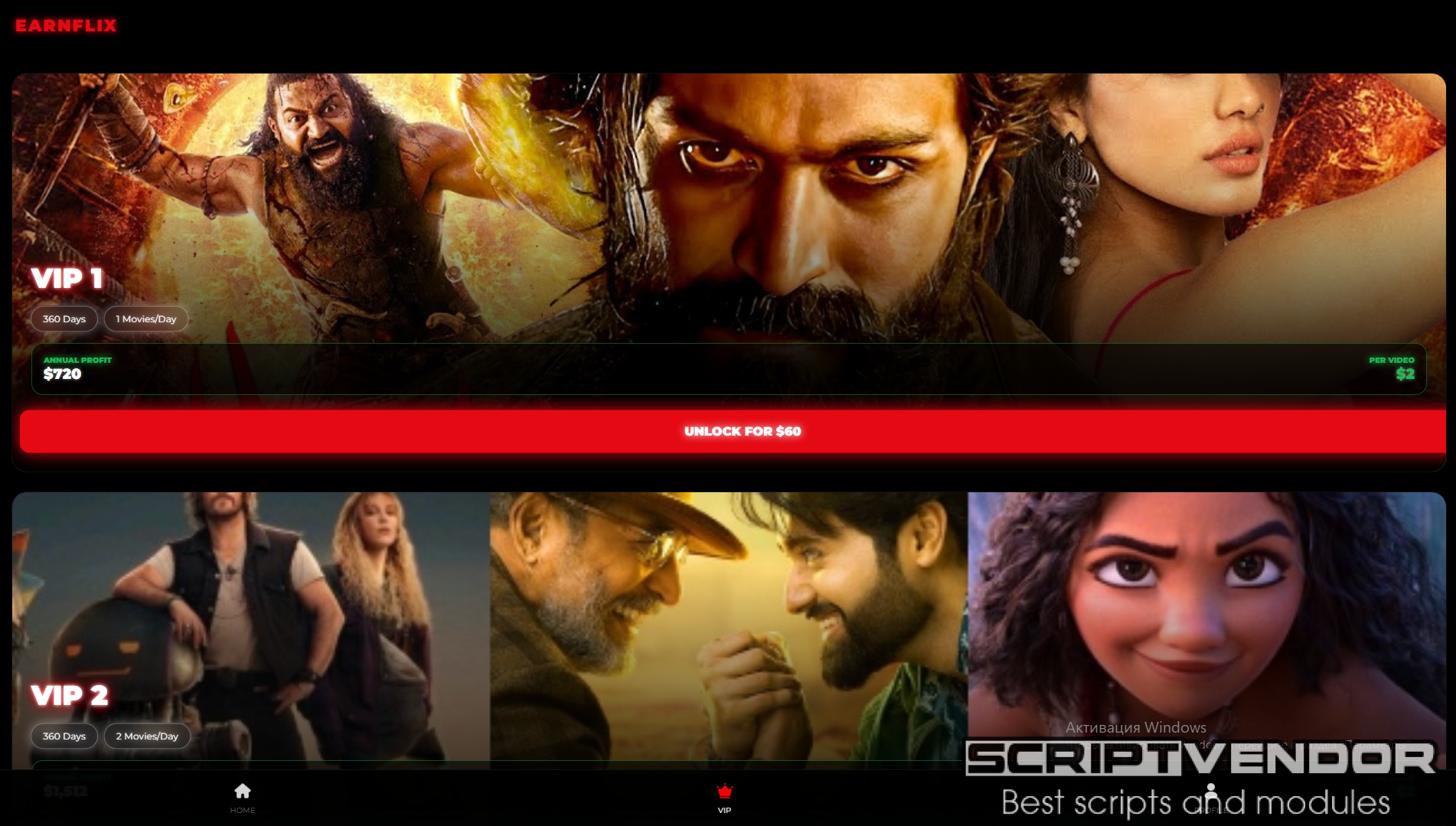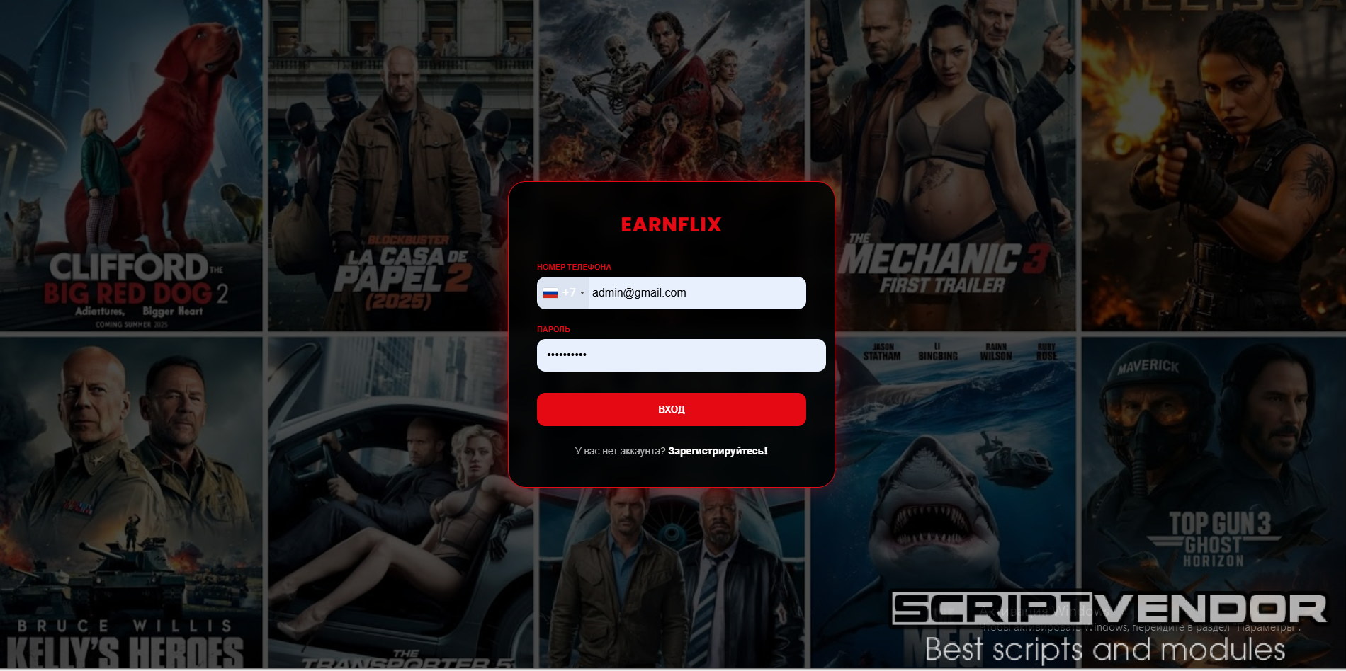 EarnFlix — это онлайн-сервис, который предлагает пользователям получать вознаграждение за просмотр различного медиаконтента (трейлеров, рекламы или коротких роликов). Интерфейс выполнен в современном темном стиле, напоминающем популярные стриминговые сервисы.